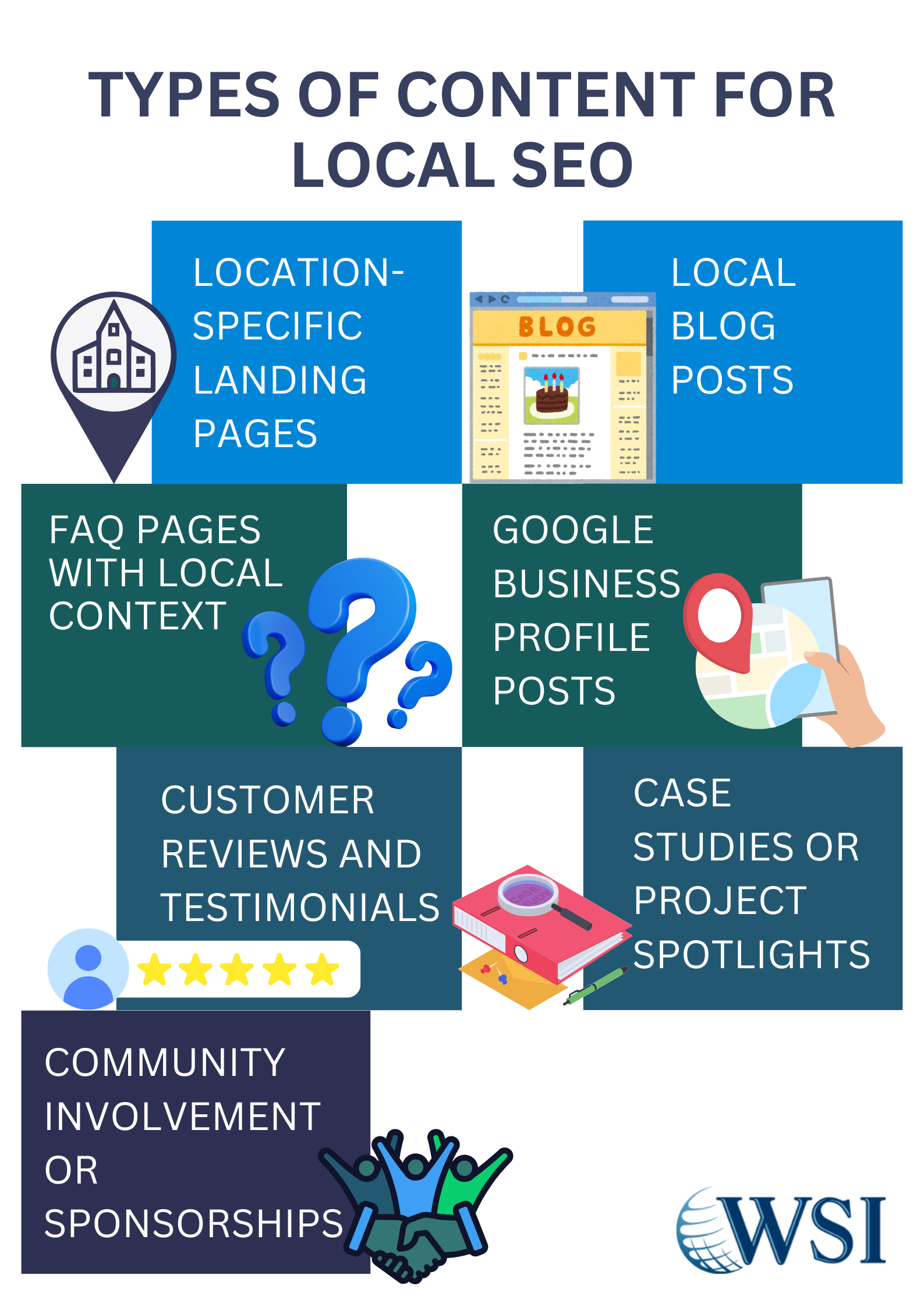 Creating locally relevant content signals to search engines (and customers) that your business is active, credible, and in touch with the community. Here are some effective content types that support local SEO: